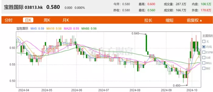 近年来,体育运动品牌的代理商日子都不好过,不仅滔搏的业绩总体表现下滑,另一大体育运动品牌代理商宝胜国际的日子同样艰难。2024年以来,宝胜国际的股价由0.63港元持续在低位徘徊,10月10日收盘,宝胜国际股价为0.58港元。自2022年3月4日以后,其股价已经长期在1港元以下徘徊(期间2022年12月6日有过一次盘中高峰值突破1港元)。2019年宝胜国际股价高点为2.884港元,股价较高点跌幅已达80%,市值蒸发了123亿港元,而如今宝胜国际的总市值只有30.89亿港元。