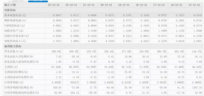 2023年,宝胜国际的营收200.6亿元,同比增长了7.65%,这也是此前三年营收连续下滑5.81%、8.83%和20.18%,2023年营收好不容易实现了增长却又在2024年上半年再度下滑。以2023年数据为参考,该年营收在近6年最低,高于2017年的188.3亿元。净利润4.904亿元,高于2017年的3.943亿元,却低于2016年的5.606亿元。这意味着宝胜国际自2017年起一直在原地踏步,赚钱能力只和2015年相差不大,而2015年宝胜国际的营收只有144.7亿元。很明显宝胜国际的净利率出现了较大下滑。