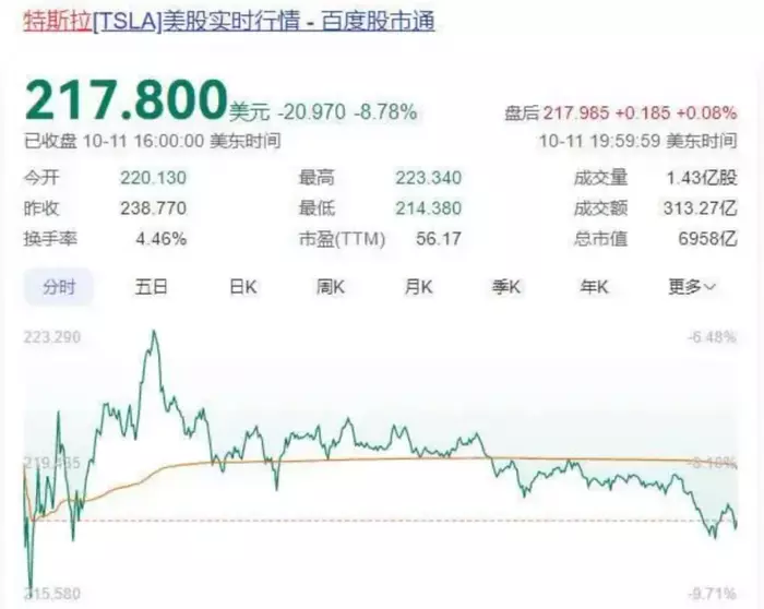 在发布会结束后,特斯拉股价大跌8.78%,美东时间10月11日收盘,特斯拉股价217.8美元,总市值6958亿美元,市值一夜蒸发670亿美元,约合4743.97亿元人民币。在本周内总跌幅超过12.9%。距离高峰值414.497美元的股价跌幅更达47.5%,几乎腰斩,市值蒸发6284亿元,约合44490亿元。而马斯克个人财富也缩水150亿美元,折合人民币1060亿。