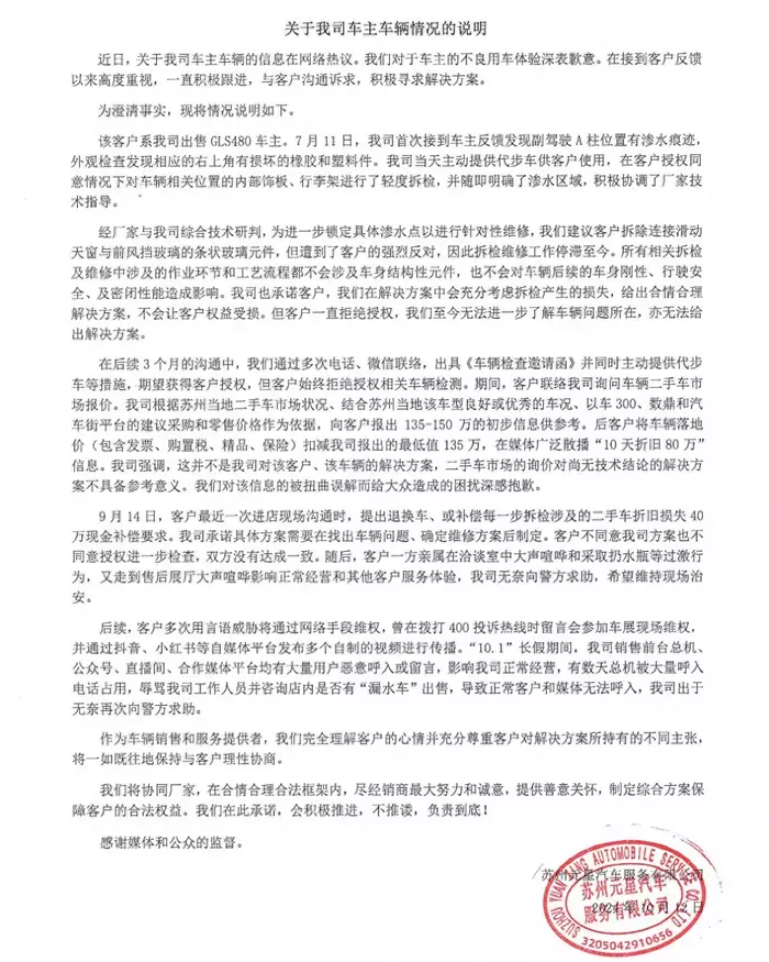 车主经过和4S店2个多月的交涉后,目前已经不再和4S店有沟通的意愿,据《九派新闻》最新报道,车主现在的诉求是奔驰官方出面道歉,并赔偿80元作为精神损失费以及这辆车退款退货。车主不需要退一赔三,只想要道歉和全部赔偿,如果退款成功将拿出退款用于帮助他人。