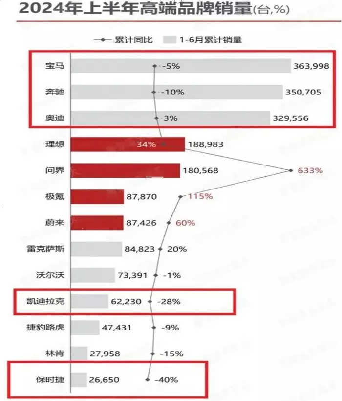 而日子不好过的并非奔驰一家,BBA豪华品牌三家全部出现了销量下滑,其中宝马下滑了5%,奥迪下滑了3%,销量跌幅最大的是奔驰。其他国外品牌中只有雷克萨斯以84823辆的销量,增长了20%,其他沃尔沃、凯迪拉克、捷豹路虎、林肯、保时捷等豪华品牌无一例外销量都出现了下滑,其中保时捷上半年直接下滑了40%的销量。反观国产理想、问界等国产品牌销量则全部实现了较大幅度的增长。其中问界增幅高达633%,极氪增幅115%,蔚来和理想分别增长60%和34%。