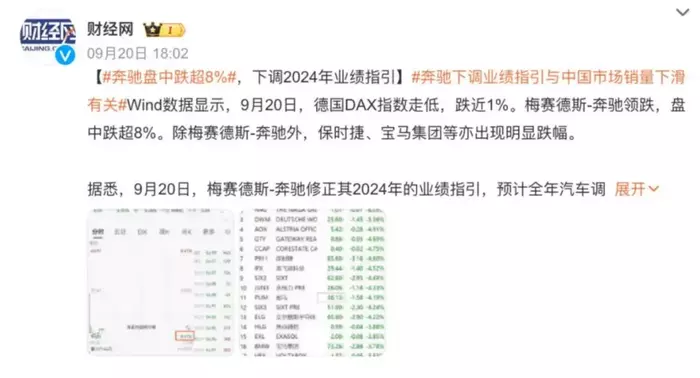 面对销量和上半年表现不佳的业绩,奔驰不得不下调了2024年业绩预期。据《财经网》9月20日报道,梅赛德斯-奔驰因中国市场业绩疲软主动下调了2024年财务预期。报道称,奔驰将其主要汽车业务的调整后利润率预期从此前的11%下调至“7.5%-8.5%”,下调幅度较大,因奔驰最大市场中国的需求进一步降温,奔驰S级和迈巴赫轿车等最昂贵车型的销量均受到冲击。奔驰方面表示今年的息税前利润预计将“显著低于”去年水平,这对奔驰通过销售豪华车型来提升盈利能力的战略带来巨大挑战。消息一出,奔驰股价大跌7.7%,为近年来最大跌幅。
