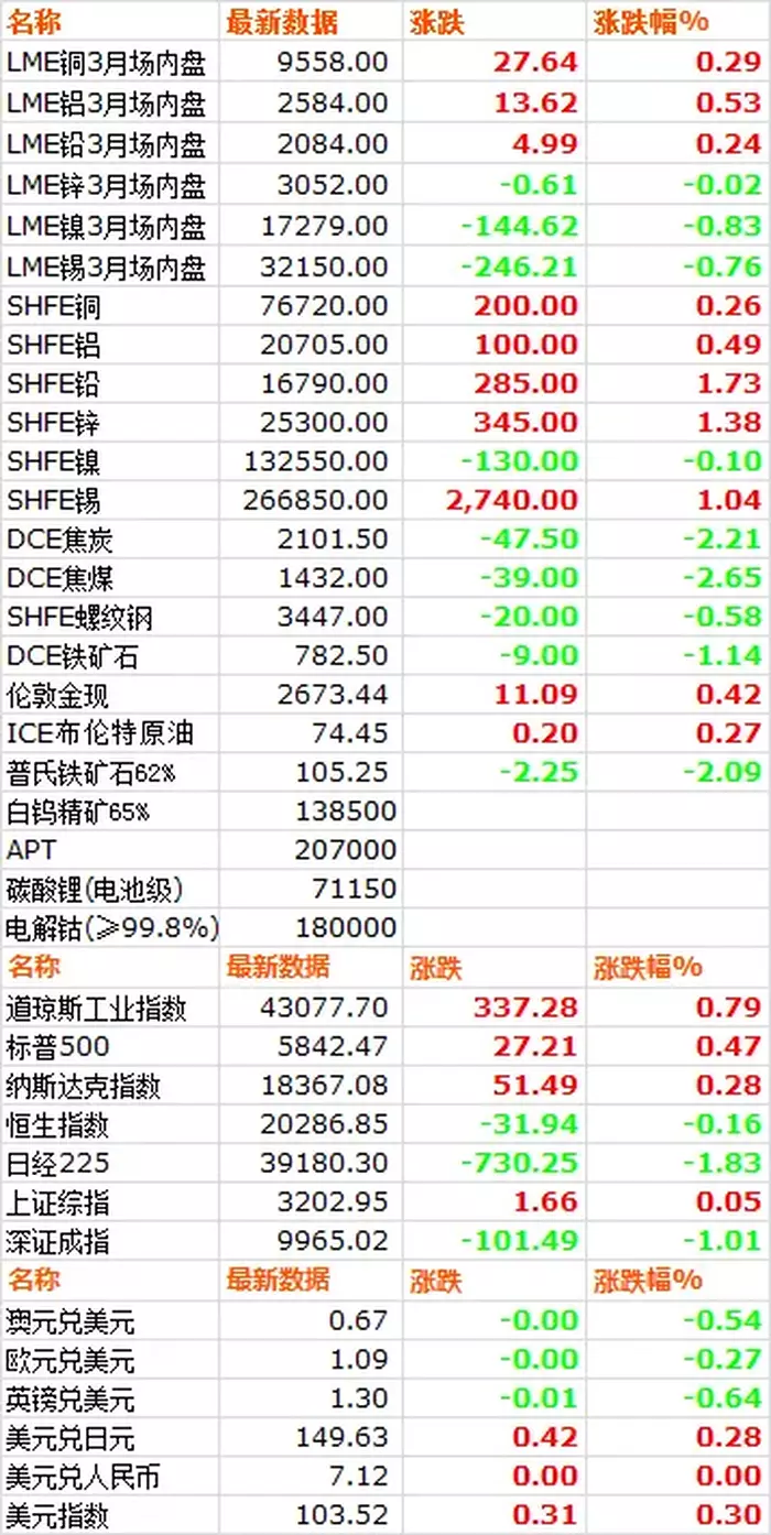 10月16日,LME六种基本金属价格涨跌互现,铜铝铅小幅上涨,锌锡镍下跌。三月期铜价收于9558.5美元/吨,上涨0.29%。三月期铝价收于2584美元/吨,上涨0.53%。三月期铅价收于2084美元/吨,上涨0.24%。三月期锌价收于3052.5美元/吨,下跌0.02%。三月期锡价收于32150美元/吨,下跌0.76%。三月期镍价收于17279美元/吨,下跌0.83%。