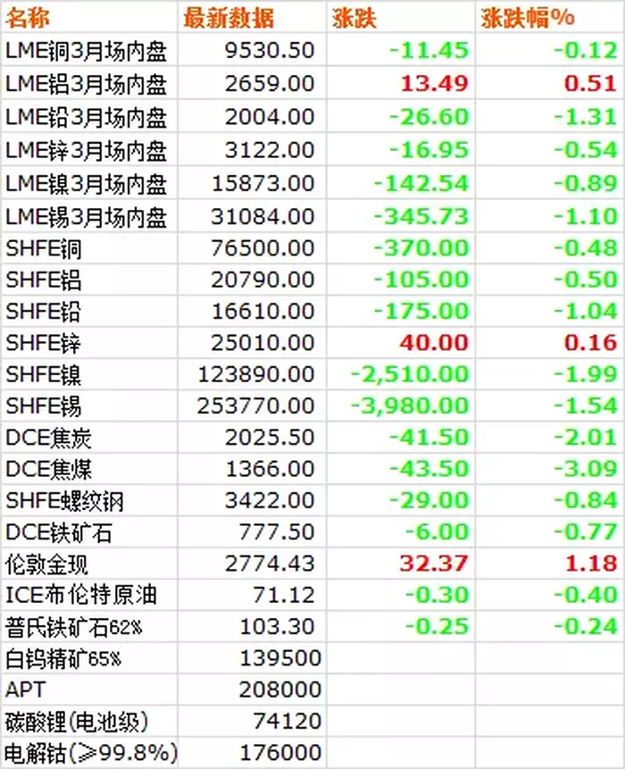 10月29日,LME六种基本金属价格跌多涨少,仅铝小幅上涨,铅领跌。三月期铜价收于9530.5美元/吨,下跌0.12%。三月期铝价收于2659美元/吨,上涨0.51%。三月期铅价收于2004美元/吨,下跌1.31%。三月期锌价收于3122美元/吨,下跌0.54%。三月期锡价收于31084美元/吨,下跌1.10%。三月期镍价收于15873美元/吨,下跌0.89%。