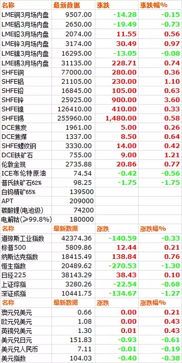 10月24日,LME六种基本金属价格涨跌互现,铜铝镍小幅下跌,铅锌锡小幅上涨。三月期铜价收于9507美元/吨,下跌0.15%。三月期铝价收于2650美元/吨,下跌0.73%。三月期铅价收于2074.5美元/吨,上涨0.56%。三月期锌价收于3174.5美元/吨,上涨0.97%。三月期锡价收于31135美元/吨,上涨0.74%。三月期镍价收于16295美元/吨,下跌0.08%。