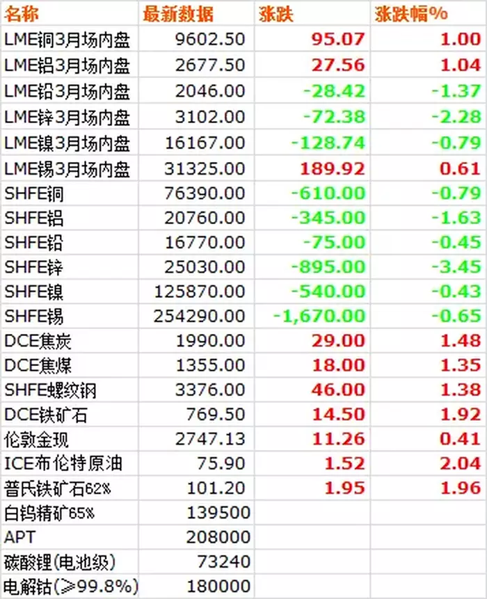 10月25日,LME六种基本金属价格涨跌互现,铅锌镍下跌,其中锌跌幅较大,铜铝锡上涨。三月期铜价收于9602.5美元/吨,上涨1.00%。三月期铝价收于2677.5美元/吨,上涨1.04%。三月期铅价收于2046美元/吨,下跌1.37%。三月期锌价收于3102美元/吨,下跌2.28%。三月期锡价收于31325美元/吨,上涨0.61%。三月期镍价收于16167美元/吨,下跌0.79%。