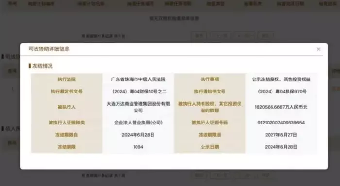 今年1月才成立的“新达盟”遭遇了多次股权冻结,天眼查法律诉讼信息显示,近日,新达盟被冻结股权数额约162亿元,冻结期限自2024年6月28日至2027年6月27日,执行法院为广东省珠海市中级人民法院。随后大连万达商业管理集团股份有限公司新增一条股权冻结信息,股权被执行的企业为大连新达盟商业管理有限公司,冻结股权数额5.41亿余元,冻结期限自2024年9月2日至2027年9月1日,执行法院为江苏省南京市中级人民法院。
