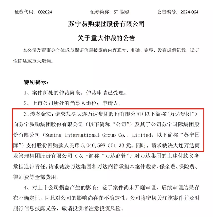 10月23日,ST易购毫无征兆地发出一则炸裂性关于重大仲裁的公告,仲裁对象是王健林的万达集团,万达商管也要承担连带责任。公告称,2018年1月29 日,苏宁易购与万达集团、万达商管签署《关于大连万达商业地产股份有限公司之战略合作协议》由子公司苏宁国际最终持有万达商管4.02%的股份。万达方面违反了协议约定,且触发了协议的股份回购条款,万达拒不纠正且拖延回购股份,苏宁易购依据协议约定向贸仲申请裁决,请求裁决万达集团和万达商管回购部分股份,支付相应的股份回购款。