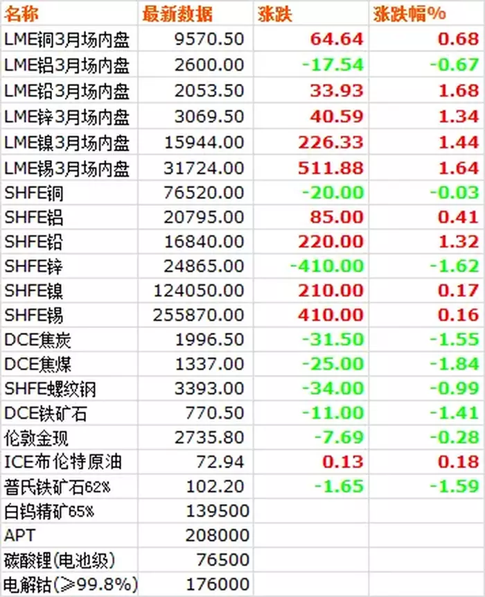 11月1日,LME六种基本金属价格涨多跌少,仅铝小幅下跌,铅领涨。三月期铜价收于9570.5美元/吨,上涨0.68%。三月期铝价收于2600美元/吨,下跌0.67%。三月期铅价收于2053.5美元/吨,上涨1.68%。三月期锌价收于3069.5美元/吨,上涨1.34%。三月期锡价收于31724美元/吨,上涨1.64%。三月期镍价收于15944美元/吨,上涨1.44%。