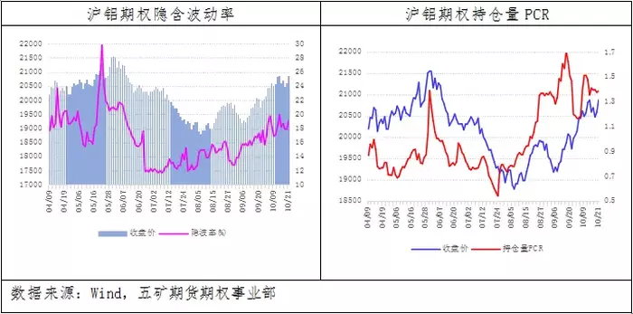 市场看涨情绪偏强,预期铝价11月主要在19000-22000元/吨区间运行。伴随铝价震荡上涨,沪铝期权隐含波动率持续回升,10月21日报收于19.32%,位于历史中位水平。从沪铝期权最大持仓量所在行权价来看,10月21日,al2412合约看跌期权最大持仓量所在行权价为19000元/吨,其次为19900元/吨,看涨期权最大持仓量所在行权价为22000元/吨,市场预期11月铝价主要在19000-22000元/吨区间运行。10月21日,看跌期权持仓量55128手,较上月同期减少1794手;看涨期权持仓量39647手,较上月同期增加1938手;持仓量PCR维持在1.39,较上月同期下降0.12,但仍位于1.00多空情绪临界值之上,市场看涨情绪偏强。