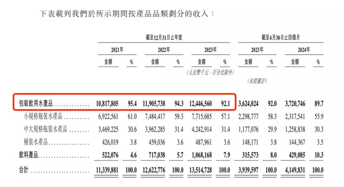 按照产品品类划分,2023年,华润饮料仍有90%以上的营收倚靠包装水,而饮料的占比虽然逐年在攀升,但尚未在完整的财年突破10%。