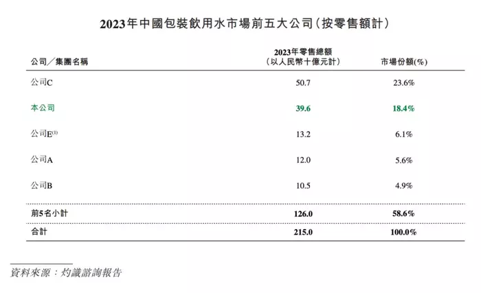华润饮料在招股书援引灼识咨询数据显示,2023年,第一名(农夫山泉)、华润包装饮用水(怡宝)在国内市场份额分别为23.6%和18.4%,断崖式领先于第三名的6.1%。