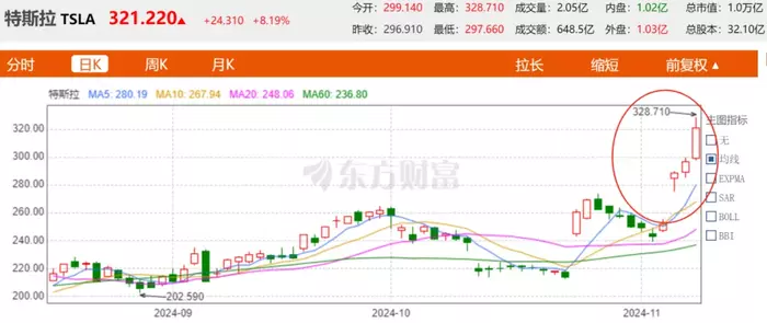 美国总统选举过后,特斯拉股价迎来一波强势连涨。2024年11月8日特斯拉股价暴涨8.19%,市值一下子飙升至1.031万亿美元。同时特斯拉还成为中国首批也是唯一一家外资公司拿到“汽车隐私保护”认证的车企。