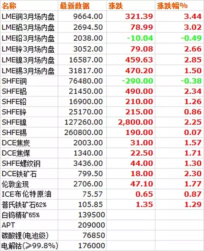11月7日,LME六种基本金属价格涨多跌少,仅铅小幅下跌,铜领涨大盘。三月期铜价收于9664美元/吨,上涨3.44%。三月期铝价收于2694.5美元/吨,上涨3.02%。三月期铅价收于2038美元/吨,下跌0.49%。三月期锌价收于3052美元/吨,上涨2.66%。三月期锡价收于31817美元/吨,上涨1.50%。三月期镍价收于16587美元/吨,上涨2.85%。