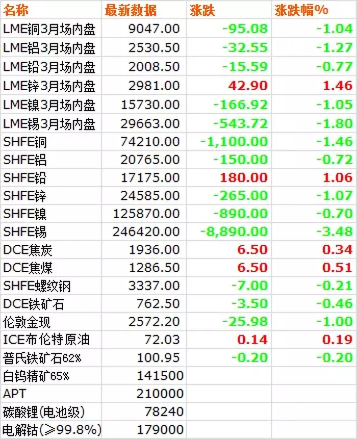 11月13日,LME六种基本金属价格跌多涨少,仅锌上涨,锡领跌。三月期铜价收于9047美元/吨,下跌1.04%。三月期铝价收于2530.5美元/吨,下跌1.27%。三月期铅价收于2008.5美元/吨,下跌0.77%。三月期锌价收于2981美元/吨,上涨1.46%。三月期锡价收于29663美元/吨,下跌1.80%。三月期镍价收于15730美元/吨,下跌1.05%。