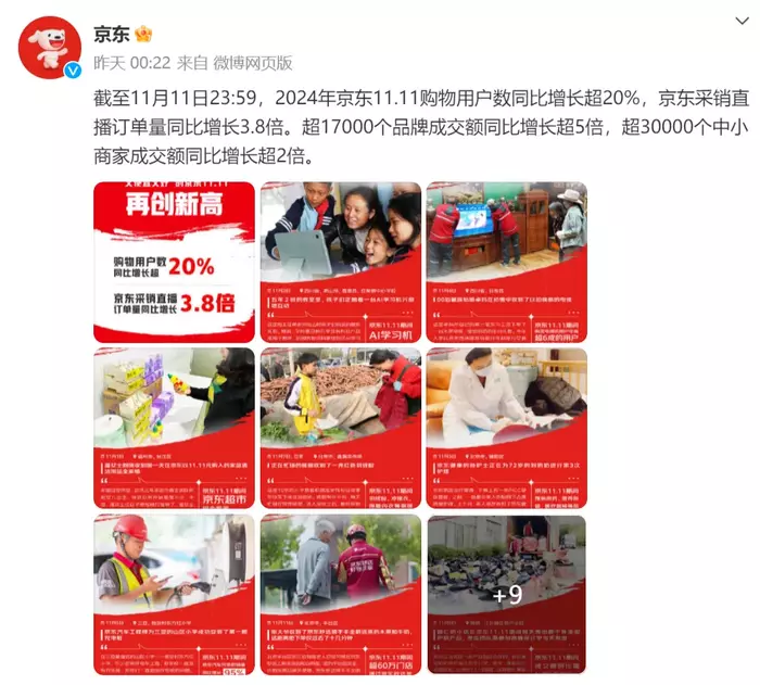 数据显示,截至11月11日23:59,2024年京东11.11购物用户数同比增长超20%,京东采销直播订单量同比增长3.8倍。超17000个品牌成交额同比增长超5倍,超30000个中小商家成交额同比增长超2倍,其中3C数码产品超千款超级爆品成交用户同比增长100%,超百款新品成交用户破百万。这在略显“静寂”的“双11”中更加难能可贵。