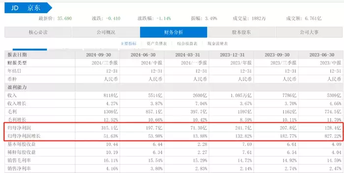 京东的坚持和努力直接表现在业绩上,2024年前三季度,京东营收8118亿元,同比增长4.27%,归母净利润315.1亿元,同比增长315.1%。其中销售毛利率为16.11%,净利率为4.16%,均创下近期新高。