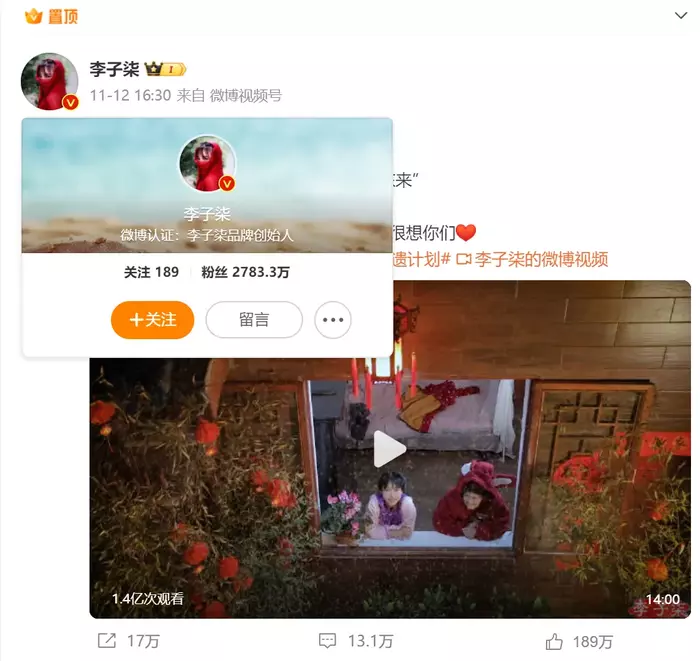 沉寂了3年的李子柒,在11月12日发布的第一条视频目前已经有超过1.4亿次观看,其个人微博账号粉丝高达2378.3万,几乎和全网热度最高的企业家雷军持平,而以其目前李子柒涨粉的速度,粉丝量大概率会超越雷军。抖音上李子柒粉丝数达5611.5万,高出雷军2200万,全网总粉丝量已经过亿。