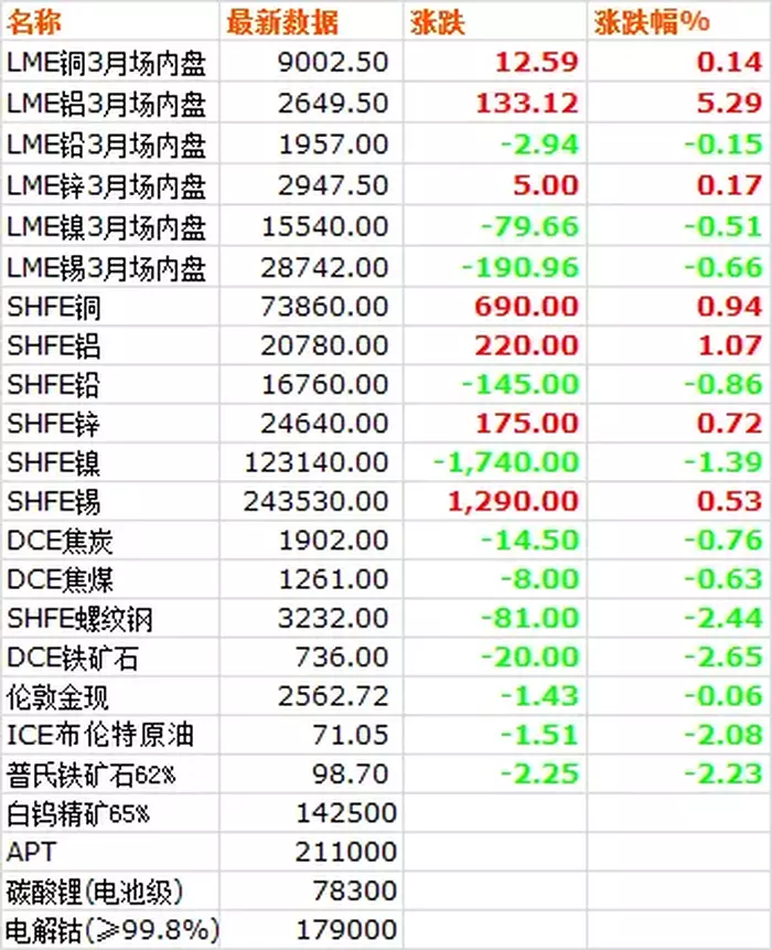 11月15日,LME六种基本金属价格涨跌互现,铝大幅上涨,铅锡镍小幅下跌。三月期铜价收于9002.5美元/吨,上涨0.14%。三月期铝价收于2649.5美元/吨,上涨5.29%。三月期铅价收于1957美元/吨,下跌0.15%。三月期锌价收于2947.5美元/吨,上涨0.17%。三月期锡价收于28742美元/吨,下跌0.66%。三月期镍价收于15540美元/吨,下跌0.51%。