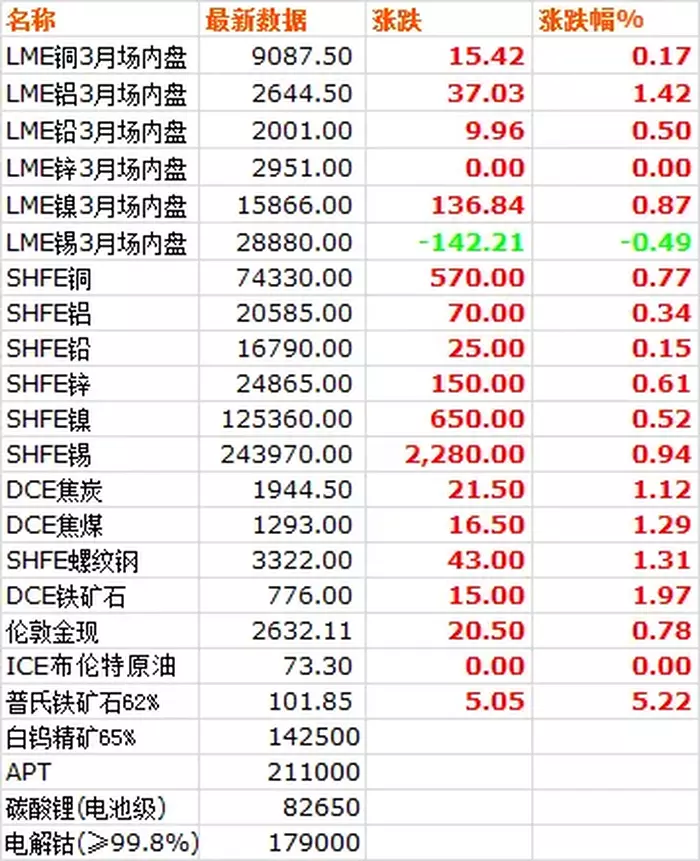 11月19日,LME六种基本金属价格涨多跌少,锡小幅下跌,铝领涨。三月期铜价收于9087.5美元/吨,上涨0.17%。三月期铝价收于2644.5美元/吨,上涨1.42%。三月期铅价收于2001美元/吨,上涨0.50%。三月期锌价收于2951美元/吨,几乎与前一日持平。三月期锡价收于28880美元/吨,下跌0.49%。三月期镍价收于15866美元/吨,上涨0.87%。