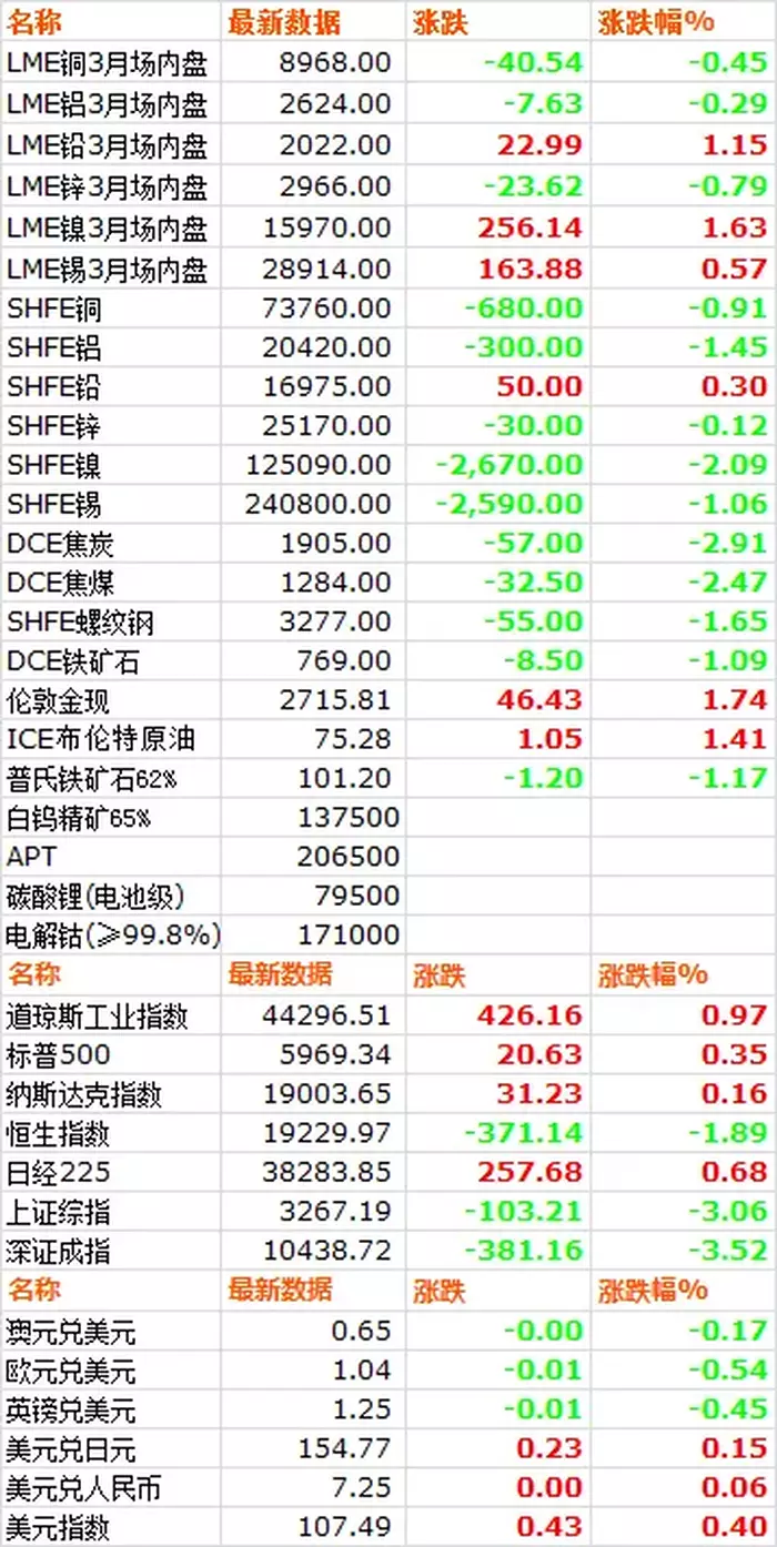 11月22日,LME六种基本金属价格涨跌互现,铜铝锌小幅下跌,铅锡镍小幅上涨。三月期铜价收于8968美元/吨,下跌0.45%。三月期铝价收于2624美元/吨,下跌0.29%。三月期铅价收于2022美元/吨,上涨1.15%。三月期锌价收于2966.5美元/吨,下跌0.79%。三月期锡价收于28914美元/吨,上涨0.57%。三月期镍价收于15970美元/吨,上涨1.63%。