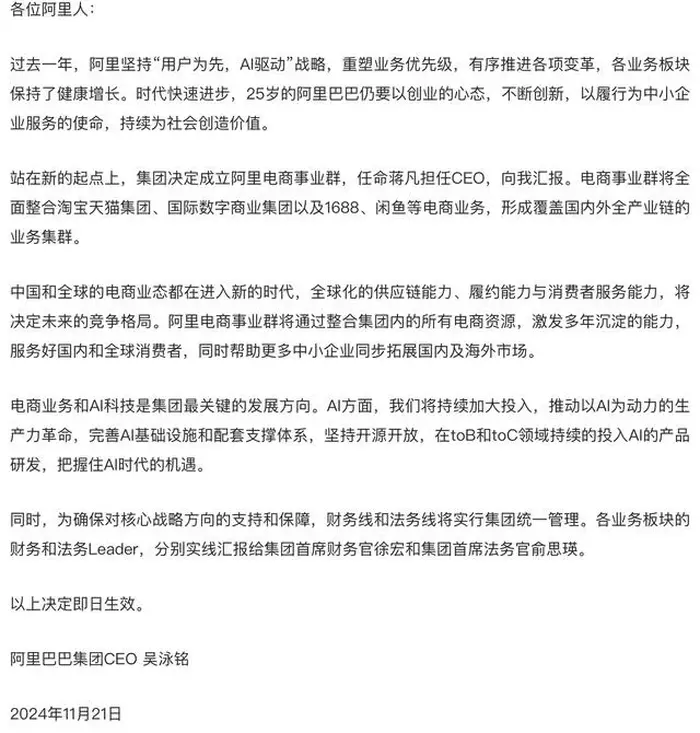 同一日,阿里巴巴集团CEO吴泳铭也发布内部信确认此事,内部信中宣布阿里新组织架构将进行调整。将全面整合淘天集团、国际数字商业集团以及1688、闲鱼等电商业务,形成覆盖国内外全产业链的阿里电商事业群。