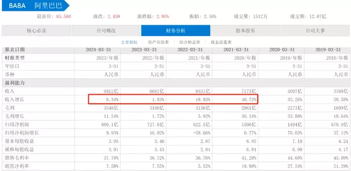 据财报显示,2023年8.34%营收增速,相比2018年和2019年50.58%、35.26%的增速明显放缓。而净利润方面,2021年还出现了58.66%的大下滑,由2020年的1506亿元直接跌至622.5亿元,自此,阿里净利润再未能突破千亿元。