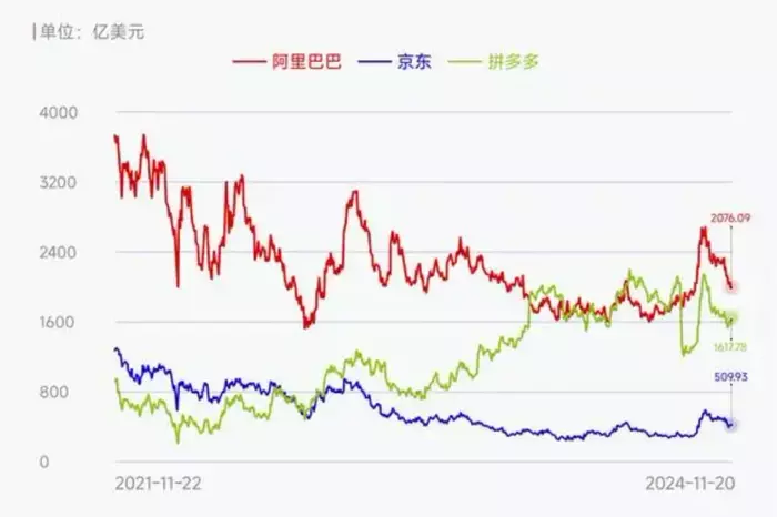 从近几年阿里、京东和拼多多的美股市值变化也可见一斑,阿里市值跌幅最大,京东市值也有下跌,相比之下跌幅更小,拼多多市值则是一路飙升,期间更是多次超过阿里,成为美股上市电商中市值最高的一家,现在阿里市值虽然反超了拼多多,两者之间差距也并不太大,阿里第一电商的位置仍面临挑战。