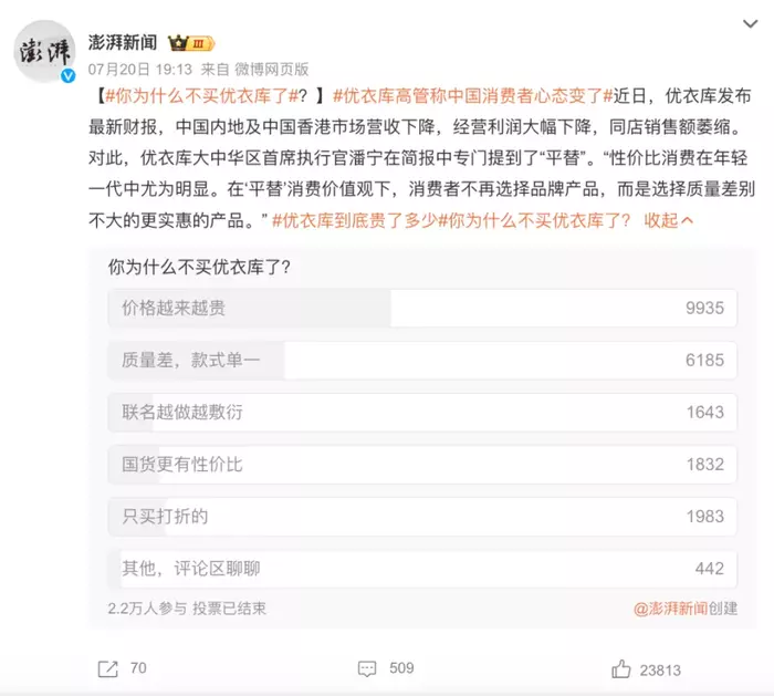 此外,优衣库还被质疑越来越贵。澎湃新闻曾做过一次调查,超过两万人参与的投票里,近一半人选了“价格越来越贵”,超过六千人认为“质量差,款式单一”。在财报发布后的简报会上,优衣库大中华区首席执行官潘宁也提到了“平替”的冲击。
