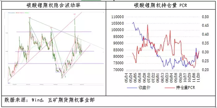 市场看跌情绪浓厚,预期12月碳酸锂价格主要在7万-9万元/吨区间运行。11月20日,碳酸锂期权隐含波动率报收于41.71%,位于长期运行区间中部水平,市场认为碳酸锂价格继续维持底部震荡概率较高。从碳酸锂期权最大持仓量所在行权价来看,11月20日,lc2501合约看跌期权最大持仓量所在行权价为7万元/吨,期权费60元/吨;看涨期权较大持仓量所在行权价为9万元/吨,期权费760元/吨,市场预期12月碳酸锂价格主要在7万-9万元/吨区间运行。从期权持仓量来看,11月20日,看跌期权持仓量53163手,较上月同期大幅增加27385手;看涨期权持仓量173175手,较上月同期增加76275手;持仓量PCR小幅盘整收于0.31,同比小幅回升0.04,仍处于较低位置,市场看跌情绪浓厚。