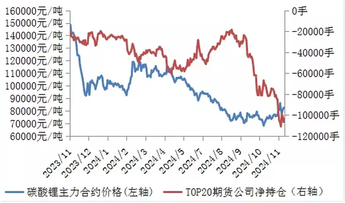 伴随锂价上涨,国内主力扩大空头敞口规模。11月20日,碳酸锂持仓量TOP20期货公司持有净空头102968手,上月同期持有净空头70798手,空头敞口进一步扩大,保持较高规模空头敞口。