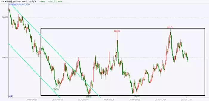 碳酸锂价格维持底部宽幅震荡。11月14日,碳酸锂价格短暂突破前期高点之后快速下跌,难以形成有效突破。11月,碳酸锂价格继续在7万-8.7万元/吨底部区间宽幅震荡。