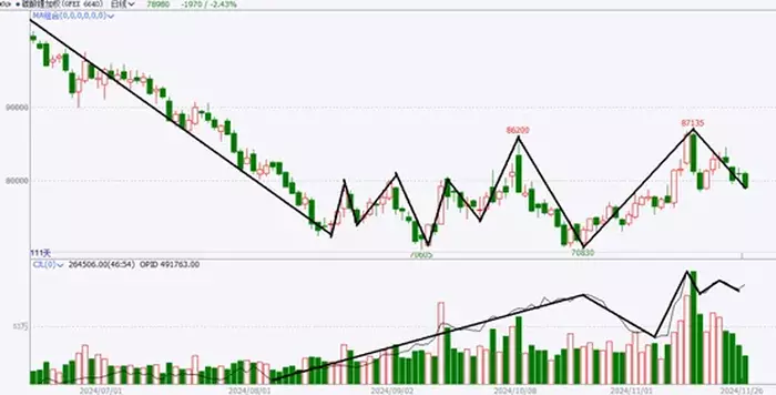碳酸锂多头增仓拉升价格未能有效突破压力位。10月22日至11月13日,碳酸锂空头撤退带动价格小幅回升,之后多头增仓拉升价格冲击8.6万元/吨压力位,未能有效突破;11月14日至25日,多头资金撤离带动价格连续两天大幅下跌,之后多头小幅增仓拉升价格,但增仓幅度小、拉涨力度弱,此后多头进一步撤离,11月26日空头试探性增仓下砸价格。11月20日,碳酸锂收盘价8.27万元/吨,较上月同期7.245万元/吨上涨14.15%。
