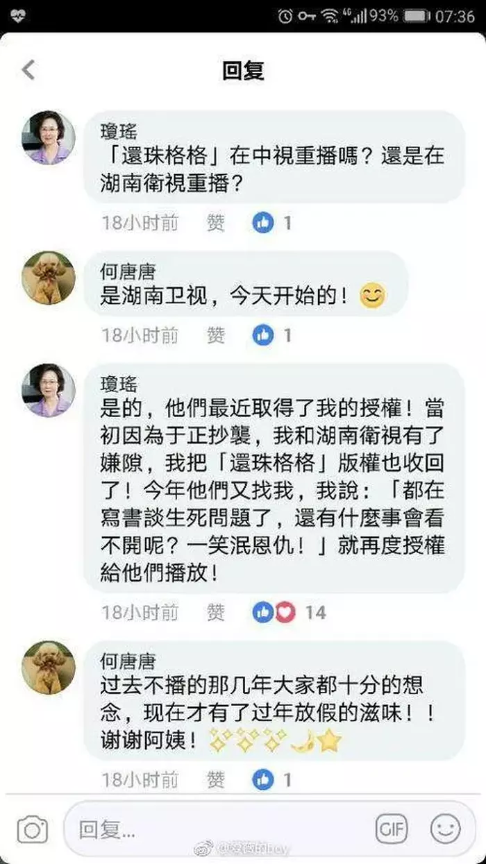 琼瑶的《还珠格格》几乎每年暑假都会重播,但期间中断了4年。因为琼瑶2015年收回了《还珠格格》的版权。直到2018年,年过八旬的琼瑶已经看淡一切,声称自己已经到了立遗嘱的年纪,看淡生死,看淡一切,和芒果一笑泯恩仇。