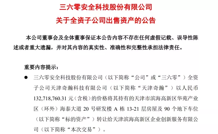 11月30日,三六零一则卖楼公告,引发市场广泛猜测。公告显示,三六零全资子公司天津奇瀚科技有限公司以1.33亿元出售所持有的位于天津市滨海高新区的房屋和车位。三六零所卖的楼位于天津市滨海高新区华苑产业区(环外)海泰大道20号,本来是三六零的研发楼,本次出售的是研发楼A栋13-21层房屋及90个地下车位。