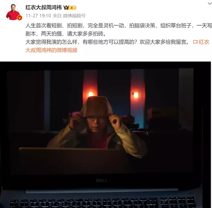 周鸿祎在微博中自嘲称:“你说我在短剧中演什么角色,我肯定演不了二十来岁的霸道总裁了,让我演50岁保洁阿姨?我的胡子拉碴效果也不太对。”“准备拉几个企业家朋友来客串一下,而这个短剧据说一天写剧本两天拍摄,预计27号在新产品发布会就能播出。欢迎大家来看看我的处女秀短剧能有多糟糕。”