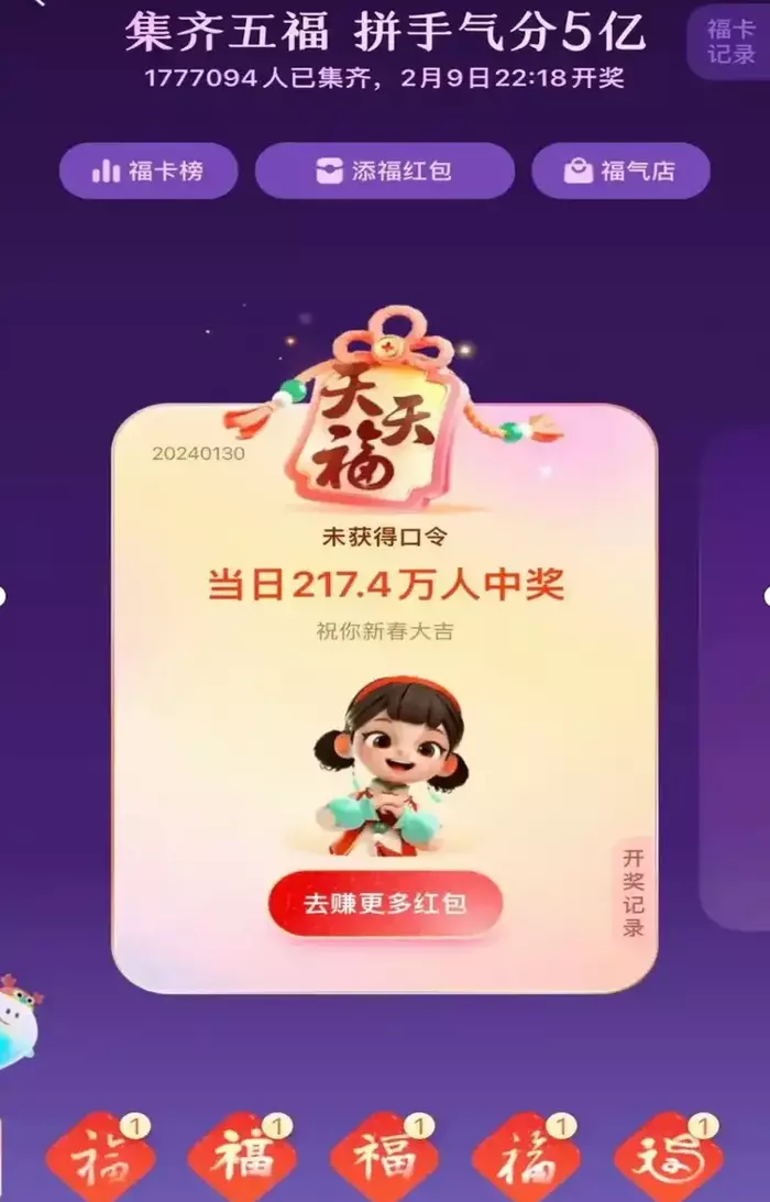 2016年,阿里支付宝不惜重金砸向春晚,2.69亿元击败了微信,用一场集五福活动成功找回了场子。2016年除夕夜,支付宝互动平台的总参与次数达到了3245亿次,是2015年春晚互动次数的29.5倍。在21点09分,互动更是达到了峰值210亿/分钟,甚至一度导致服务器宕机。