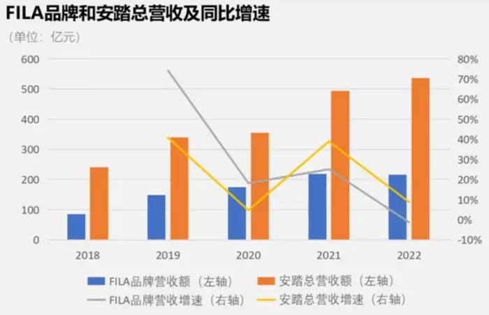 根据安踏体育的财报,2019年至2022年,FILA的营收增速分别为73.9%,18.1%和25.1%。2019年,斐乐营收突破百亿,两年后就直接突破200亿大关,2021年营收218.2亿元。此时李宁2021年营收不过是225.72亿元,安踏旗下一个品牌就已经可以抗衡李宁。十二年来,一直被安踏压在身下的李宁也没有安踏旗下斐乐这样拿得出手的品牌。