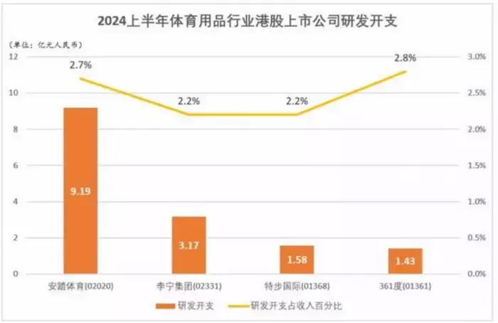 产品力未跟得上价格,根源或在于研发力度不强。2024年上半年,李宁研发费用为3.16亿元,研发费用占总营收的比例仅为2.2%,这一比例不仅远低于阿迪、耐克这样的巨头,老对手安踏超过9亿元的研发费用几乎是李宁的3倍,且研发占比也低于安踏的2.7%,特步的研发占比也有2.4%,361度的研发占比为2.8%。
