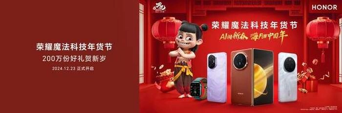 【2024年12月23日 北京】AI闹新春,嗨FUN中国年!12月23日,荣耀终端有限公司CEO赵明在荣耀Magic7 RSR 保时捷设计及影像技术发布会上,宣布荣耀成为电影《哪吒之魔童闹海》(下称“哪吒”)官方合作伙伴,并同步开启2025荣耀魔法科技年货节活动,为消费者奉上“套福气”、“购喜乐”、“抢好运”、“添年味”、“传欢乐”等一系列“精彩节目”,以体验卓越的荣耀产品及诚意满满的互动和福利惊喜,用丰富的线上线下玩法,与消费者携手共同奔赴2025。