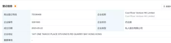 天眼查显示,张一鸣旗下的Cool River Venture公司注册时间为2023年5月22日,是家成立时间仅一年多的新公司,性质是私人股份有限公司。