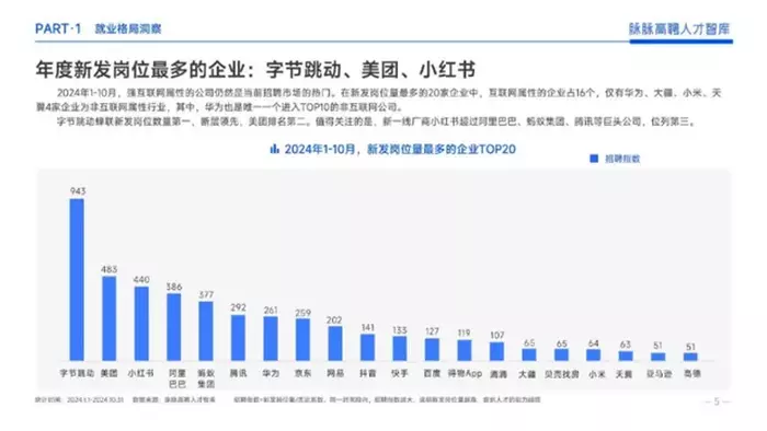 今年前10月,字节跳动新增岗位达943人,蝉联新发岗位第一,几乎是排名第二美团的两倍,美团同期新发岗位483人,脉脉高聘数据显示,字节跳动招聘岗位以深度学习、大模型算法等AI相关的技术岗位为主,可见字节跳动在AI领域的布局之深。