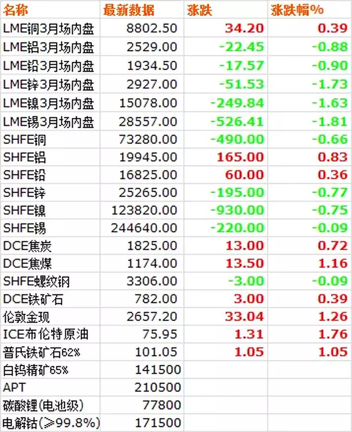 1月2日,LME六种基本金属价格跌多涨少,仅铜小幅上涨,锡跌幅居前。三月期铜价收于8802.5美元/吨,上涨0.39%。三月期铝价收于2529美元/吨,下跌0.88%。三月期铅价收于1934.5美元/吨,下跌0.90%。三月期锌价收于2927美元/吨,下跌1.73%。三月期锡价收于28557美元/吨,下跌1.81%。三月期镍价收于15078美元/吨,下跌1.63%。