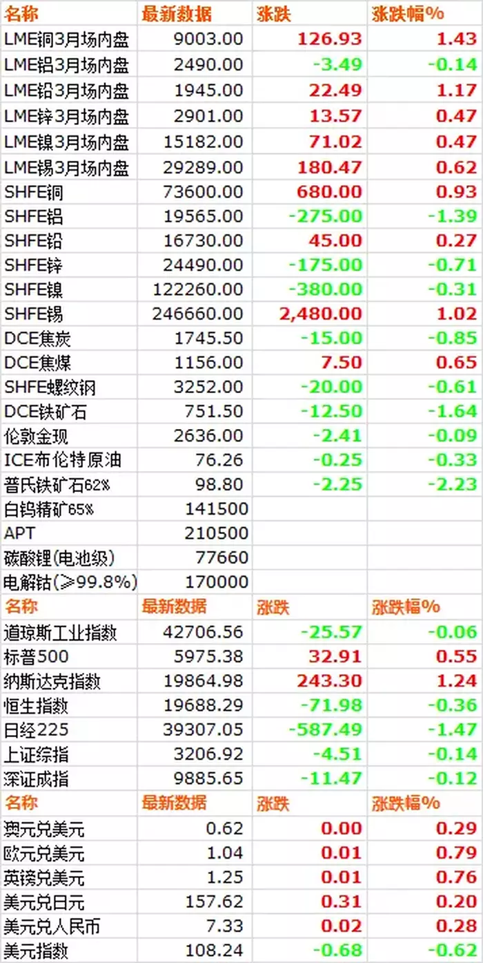 1月6日,LME六种基本金属价格涨多跌少,仅铝小幅下跌,铜领涨。三月期铜价收于9003美元/吨,上涨1.43%。三月期铝价收于2490美元/吨,下跌0.14%。三月期铅价收于1945.5美元/吨,上涨1.17%。三月期锌价收于2901.5美元/吨,上涨0.47%。三月期锡价收于29289美元/吨,上涨0.62%。三月期镍价收于15182美元/吨,上涨0.47%。