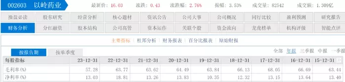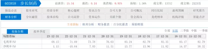 以步长制药为例,2021年至2023年其毛利率为73.78%、71.69%和68.15%,但对应净利率分别为7.03%、-10.64%和1.15%,2022年的净利率竟然为负值。2024年前三季度步长制药的毛利率下降至57.12%,净利率为2.56%。2019年之前步长制药的毛利率长期在80%以上,但上市以来净利率只有2015年超过30%,其他年份净利率基本都在10%-20%之间,2020年后直接降至10%以下。