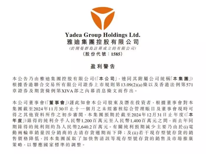 雅迪在公告中对业绩下滑作出解释,公告称业绩下滑主要由于电动两轮车销量因分销商的去清存货周期,而现存型号存货的销售价格降低,雅迪为响应国家标准的调整加快清库存。