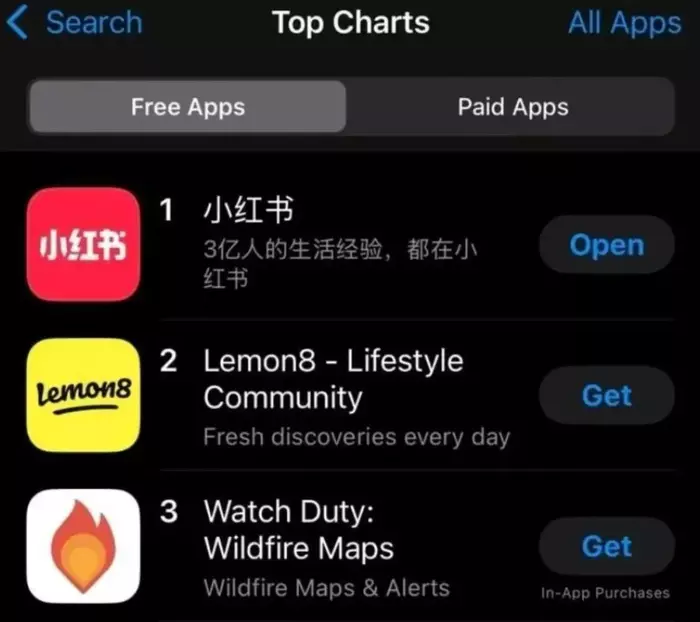 这导致小红书在1月13日登顶成为苹果应用商店(App Store)美国区下载量最高的免费应用,一夜之间上百万来自美国的“TikTok难民”涌入中国社交APP。小红书APP一跃成为美国下载第一的社交平台软件。
