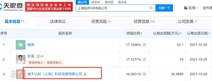 据天眼查显示,上海脑虎科技是一家脑机接口公司,已发布集成式颅顶半植入医用级BCI产品NeuroInterface、高频脑电信号处理仪CereCube、软件及算法云平台MindExplorer三款产品。天眼查显示盛大认知科技发展有限公司是脑虎科技的第三大股东,而盛大认知科技发展有限公司由盛大100%控股。