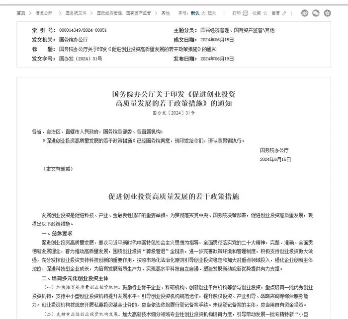 2024年6月19日,国务院办公厅发布了《促进创业投资高质量发展的若干政策措施》。这是继2016年国务院出台《关于促进创业投资持续健康发展的若干意见》8年后,国家层面出台的又一部促进创业投资高质量发展的系统性政策文件。