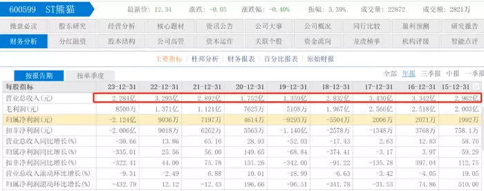 要知道ST熊猫2015年至今业绩表现每况愈下,2015年ST熊猫营收2.962亿元,2023年营收则为2.284亿元,也就是说9年间ST熊猫的营收不升反降。2015年ST熊猫净利润为1992万元,2023年则是净亏损2.124亿元。而2022年,ST熊猫的净利润还是9036万元。